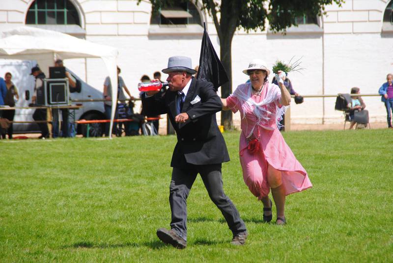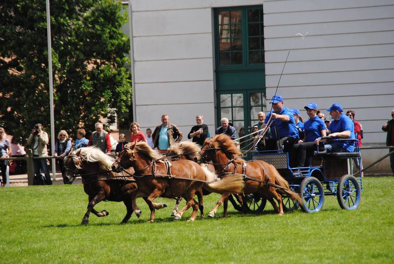 Auch der Spaß kommt bei den Shetty-Züchtern nicht zu kurz. Familie ... hat uns danach gezeigt, wie eine Hochzeit auf italienisch aussieht. Ohne Unterbrechung folgte gleich mit dem nächsten Programmpunkt die Vorstellung der Shetlandponys vor dem Wagen in verschiedenen Anspannungen. Ob allein, zu zweit, zu viert oder sogar zu fünft vor dem Wagen, Shetlandponys ziehen alles weg. Im Verhältnis zu ihrem Körpergewischt sind sie die stärkste Pferderasse, die gezüchtet wird. Familie Schörfke hatte uns noch eine zweite Vorführung zu bieten. Im Tutu auf Spitzenschuhen wurde ... von ... auf dem Hengst Avalon zu klassischer Musik begleitet. Dieses Ballett passte wundervoll vor die großartige Kulisse des Redefiner Portals.